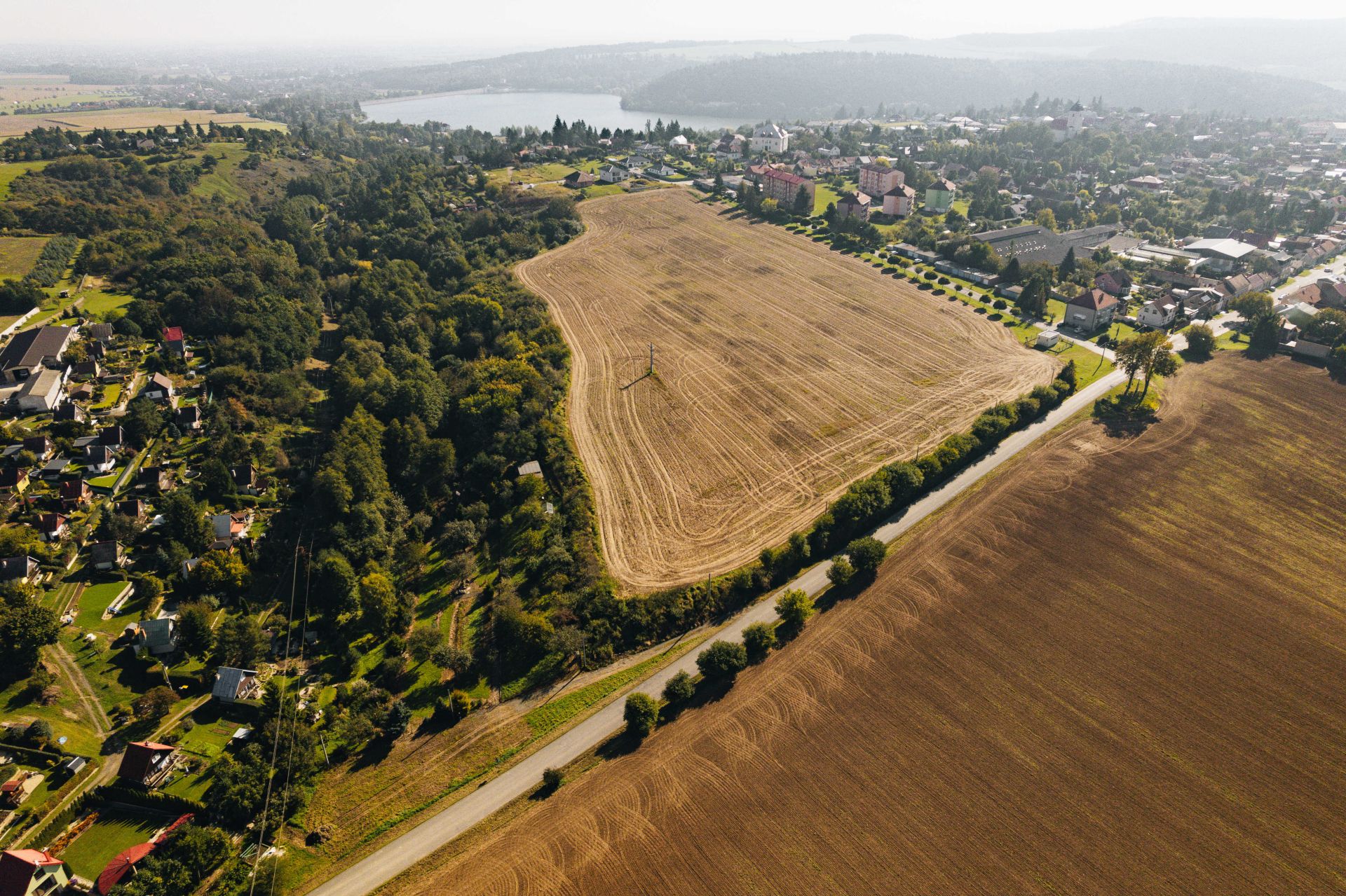 Mírně svažitý obdélníkový pozemek - zahrada s chatkou, orientace na západní stranu. Snadná dostupnost